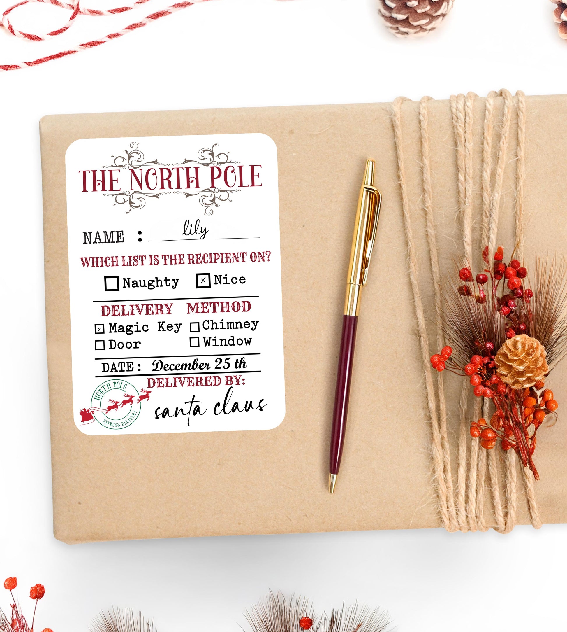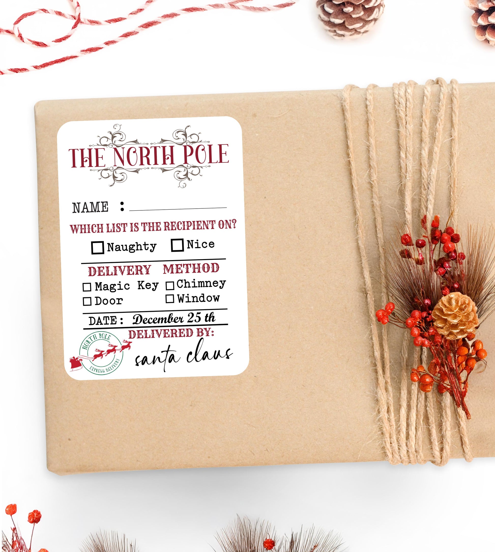 Made from high-quality matte sticker paper, each label features a blank box where you can write any name, along side check boxes for delivery method, creating a truly special and customised experience for your little ones. Perfect for adding to Christmas Eve boxes, presents, or holiday decor. Bring the spirit of Santa to life this holiday season!