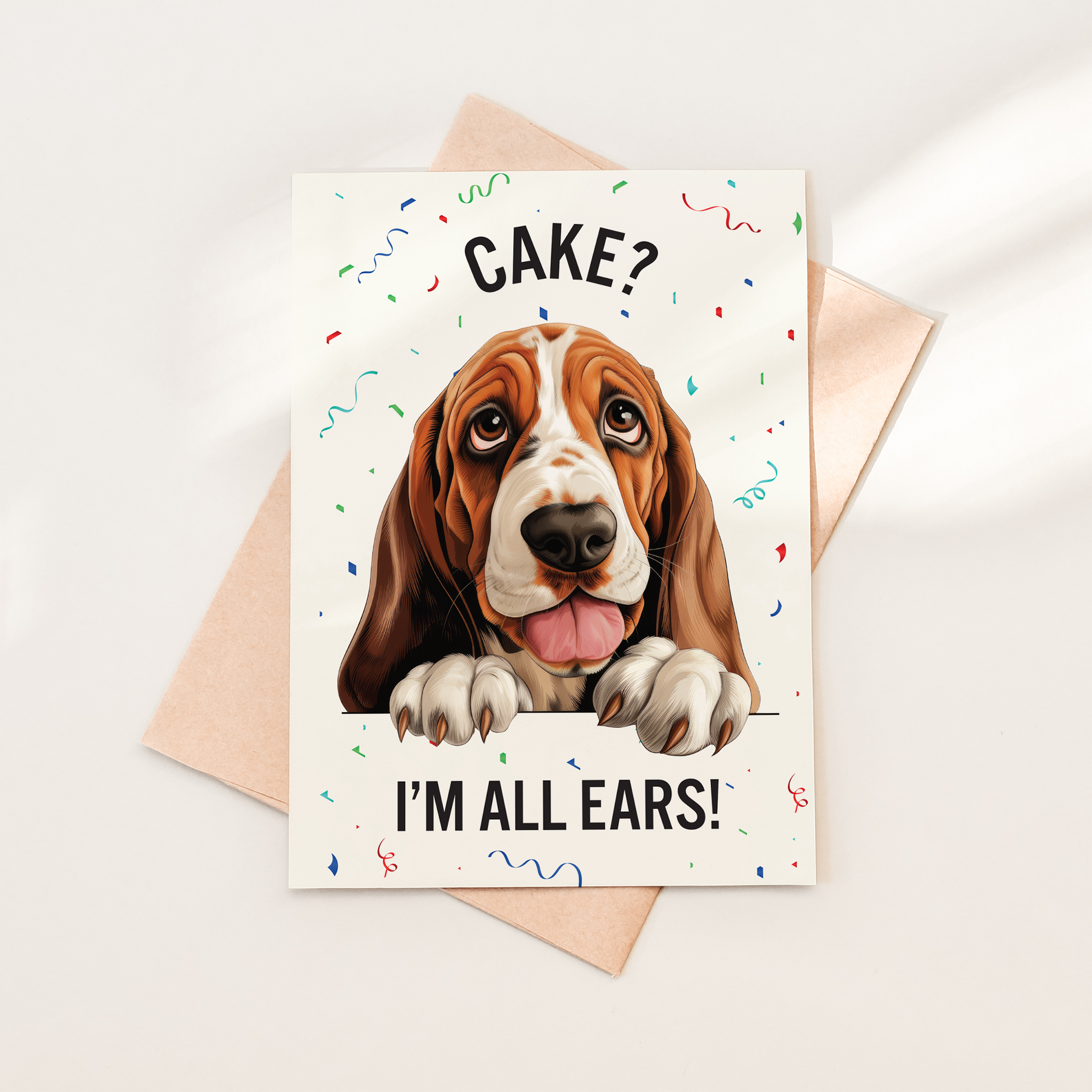 Celebrate a special birthday with this charming greeting card featuring an adorable Basset Hound and the playful text, "Cake?" "I'm all ears."