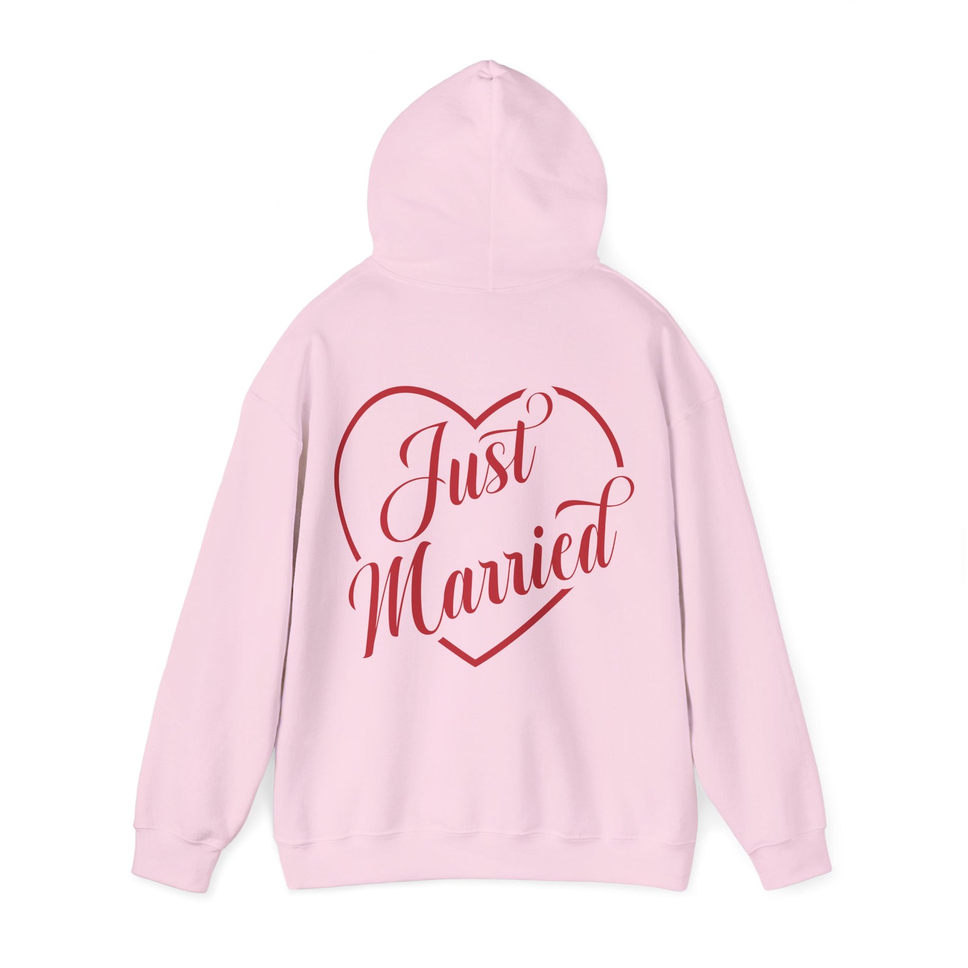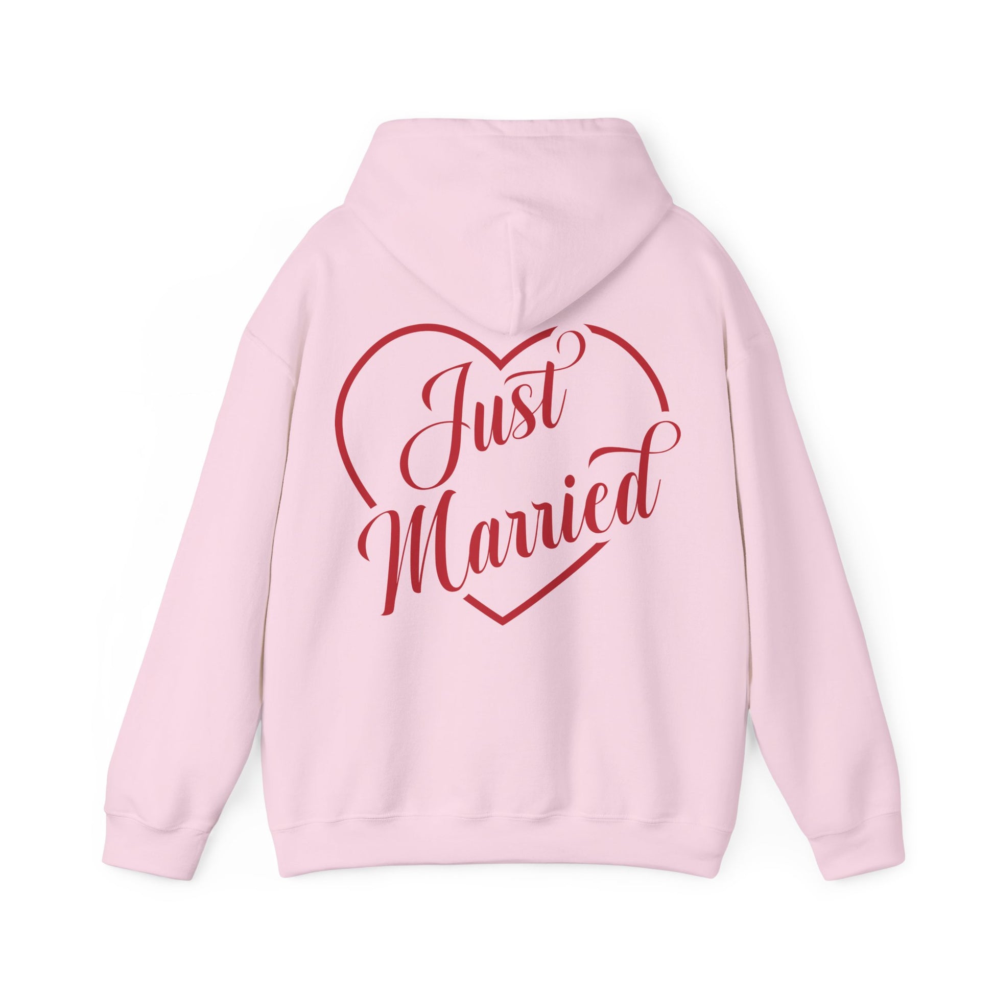 Just Married Hoodie — Romantic Bridal Sweatshirt with Heart Script