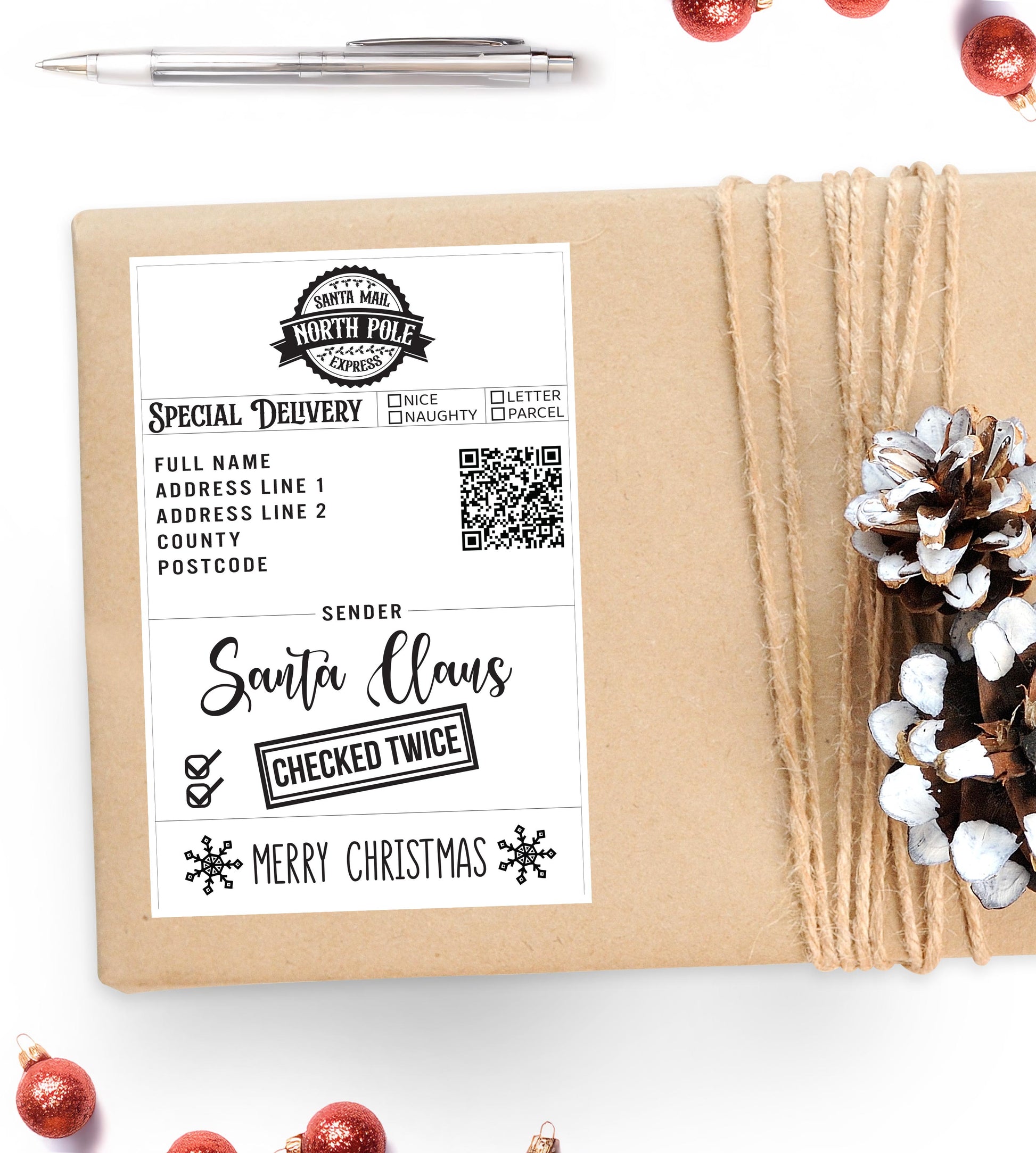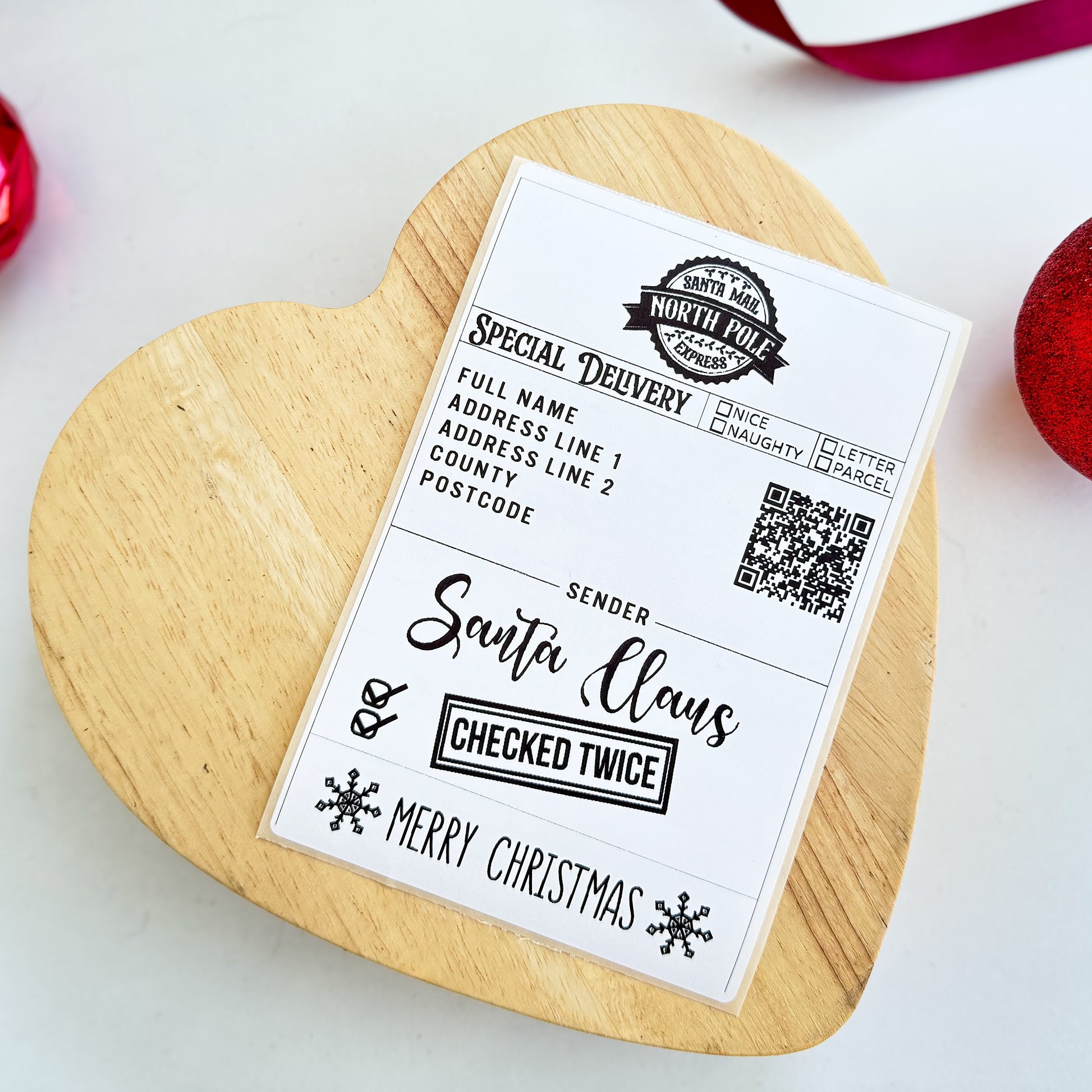 Designed with authentic North Pole Santa Mail Express details, the label includes 2 checkboxes to choose between Naughty or Nice and 2 checked by, Santa & Head Elf