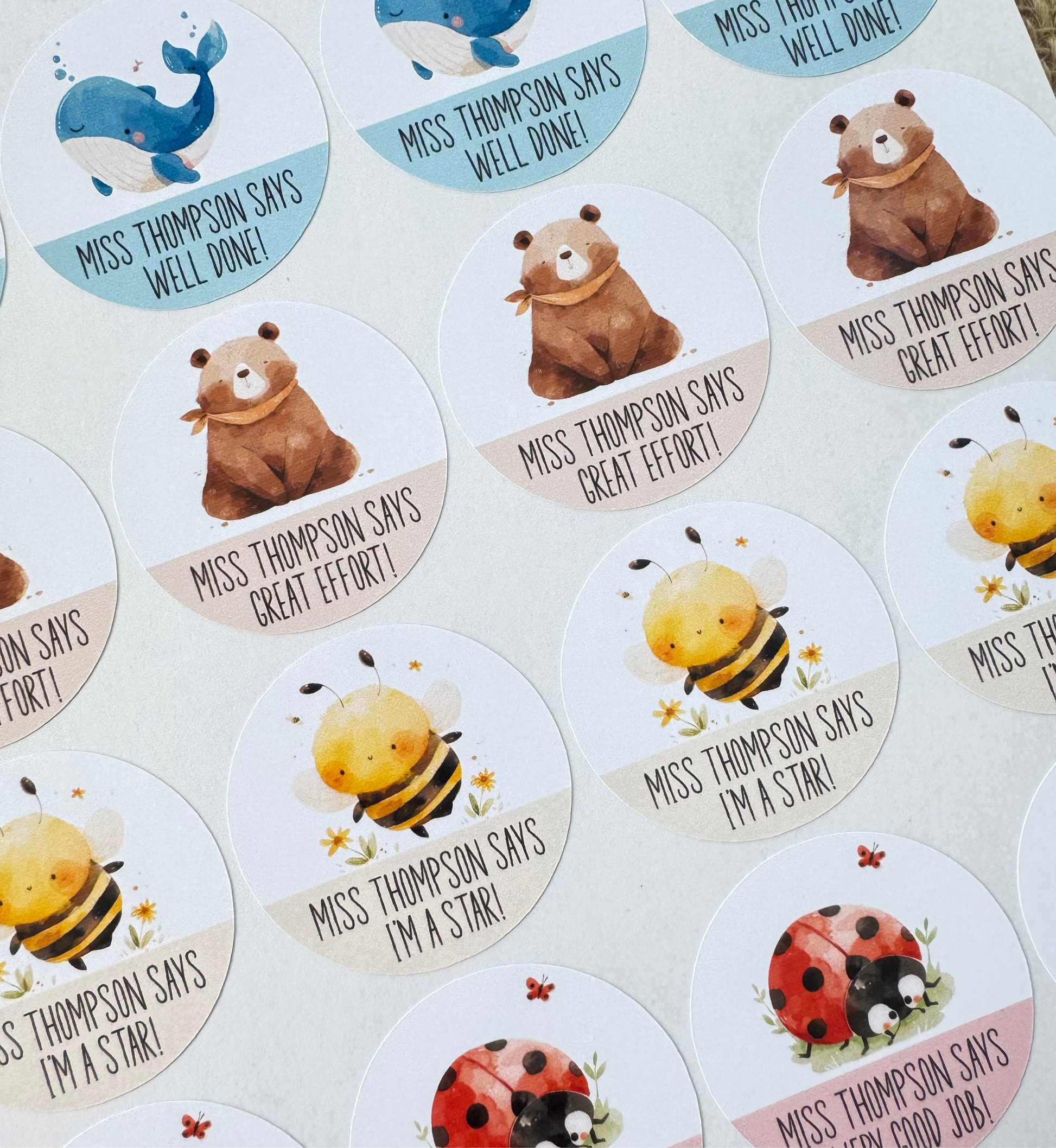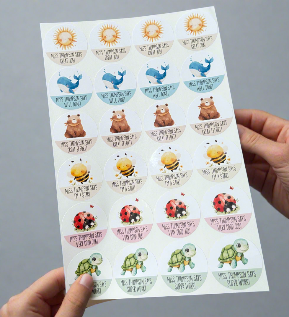 Personalise them with your teacher's name and make learning even more exciting. Ideal for classrooms, homeschooling, or as a thoughtful gift for educators. Add some fun and motivation to every lesson with these charming, colourful stickers!