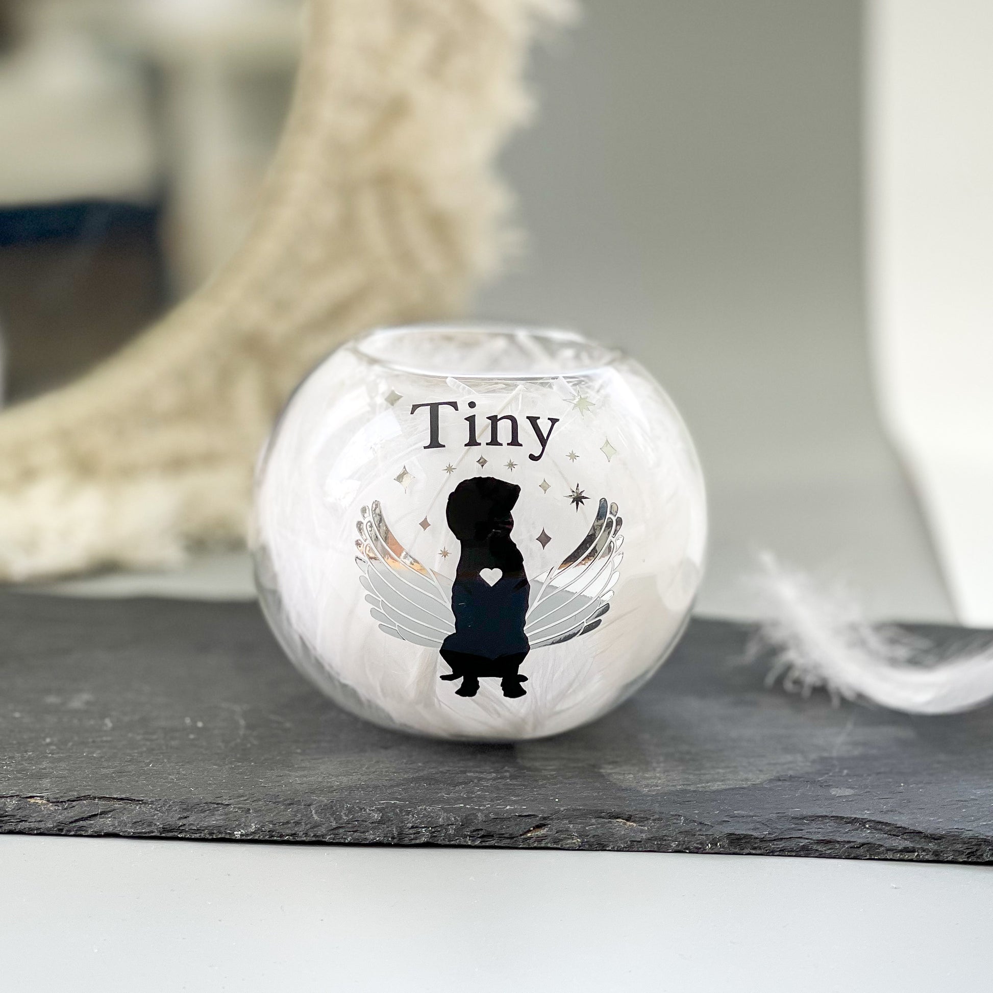 Our glass feather filled tea-light holder, personalised just for you, for lighting time after time in loving memory of those we miss.