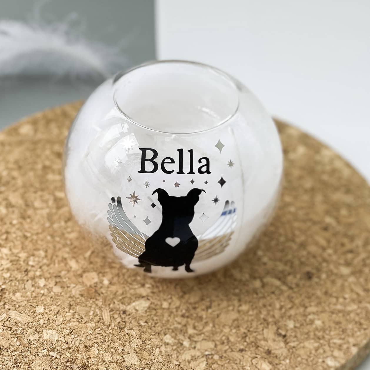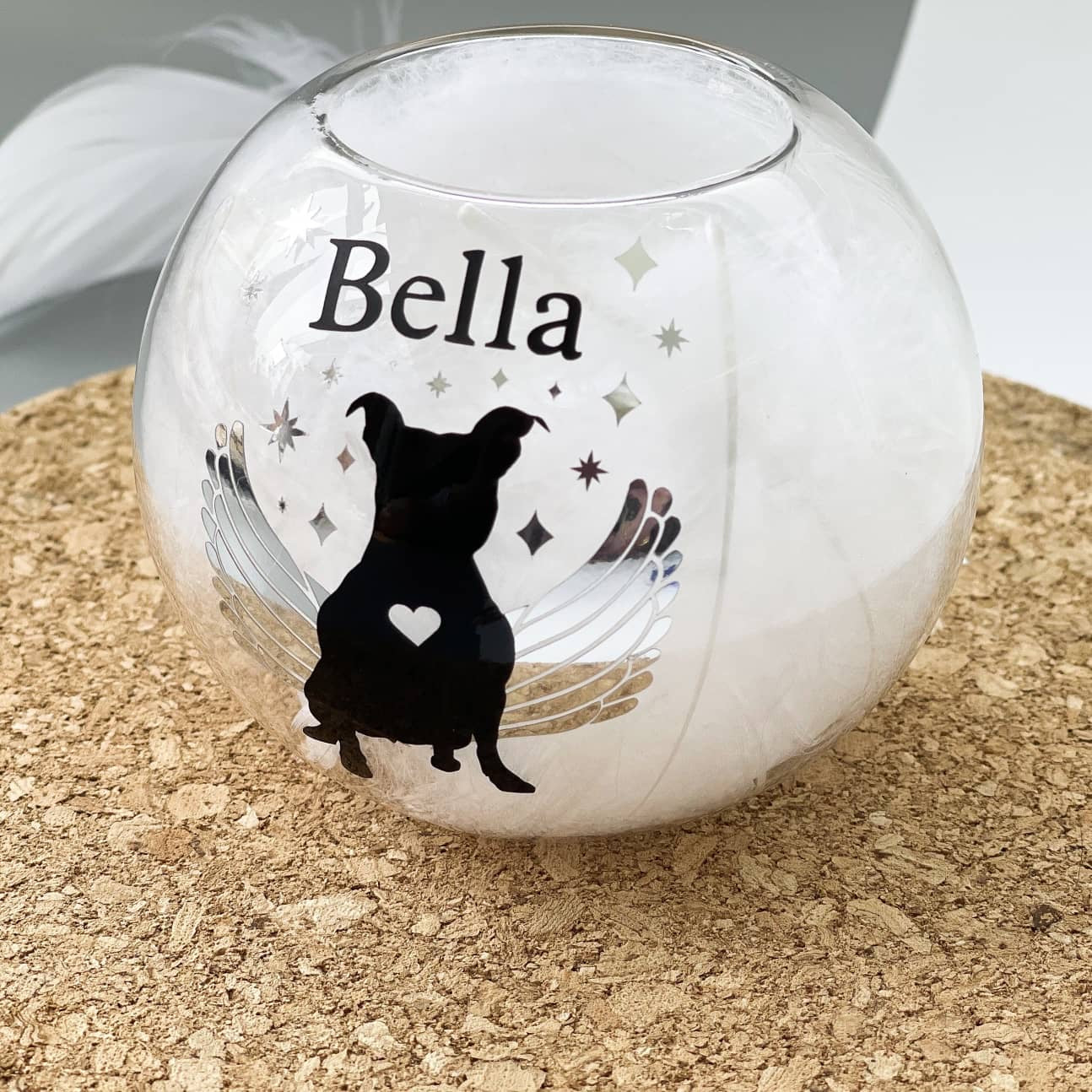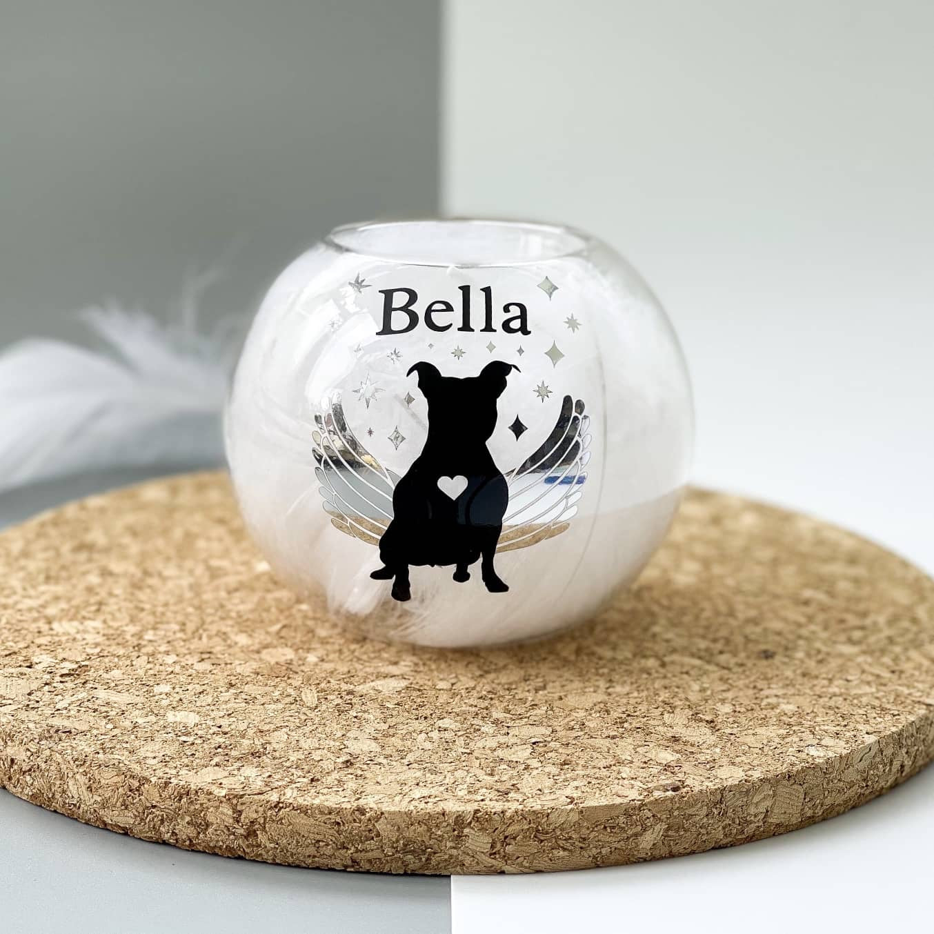 Filled with fluffy white feathers, finished with a silhouette of Staffordshire Bull Terrier with silver wings, finished with your pets name, surrounded by silver stars.