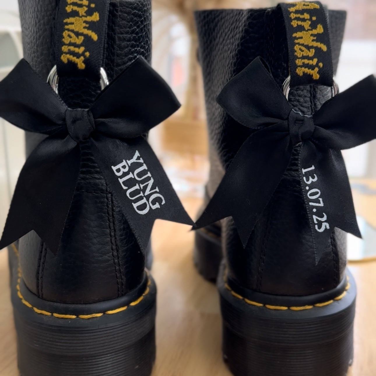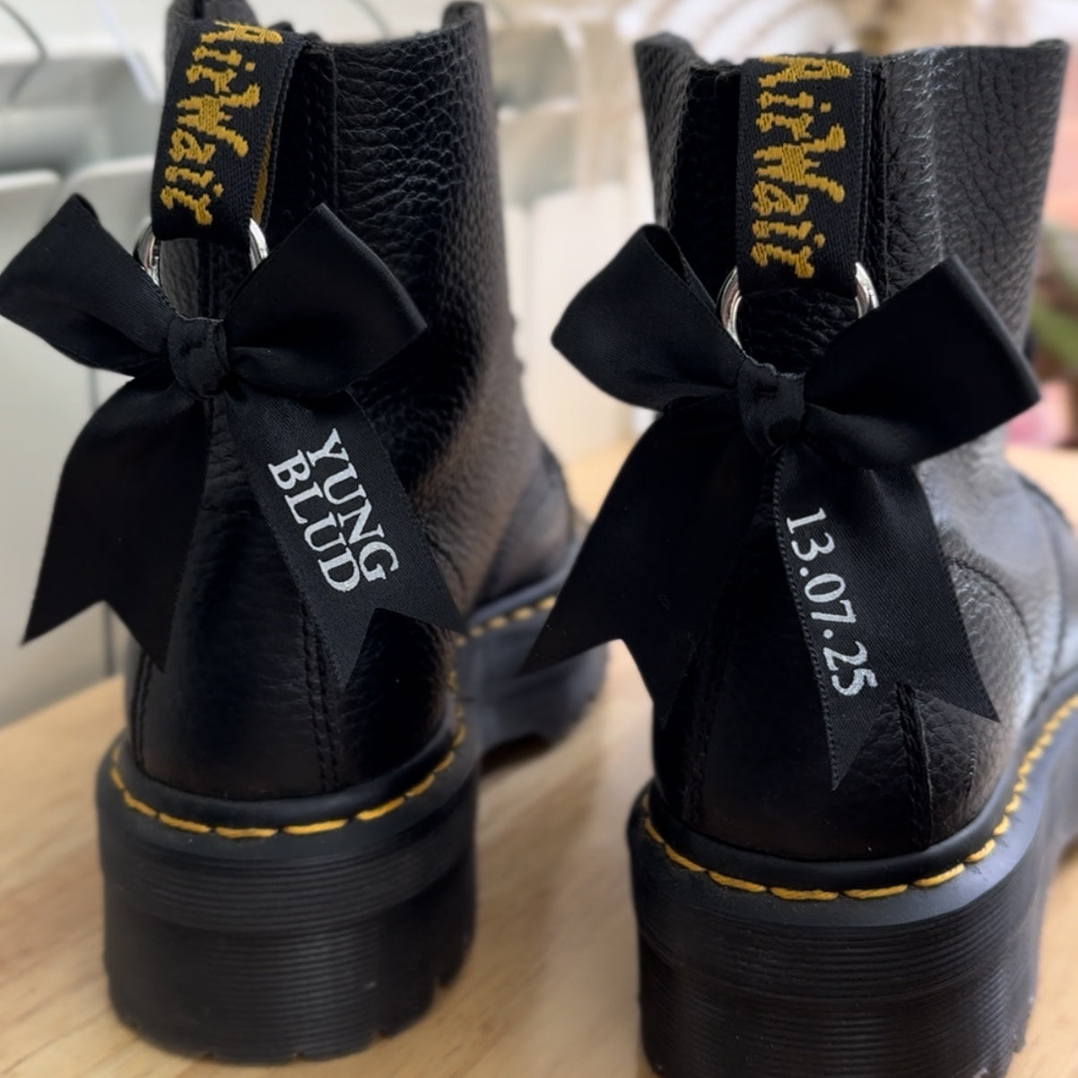 Add a personal touch to your boots with our Yungblud - Black Bow Boot Charms—designed to give your Doc Martens (or any boots with a tag) a bold yet elegant twist.